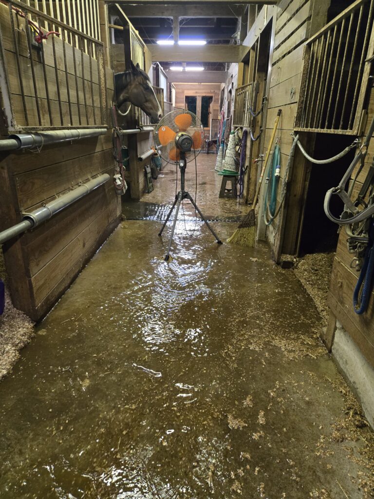 2025年7月に発生した集中豪雨により厩舎および餌置き場は床上まで水が入り込み、馬房も全室が浸水するという深刻な浸水被害を受けました。この浸水により、敷料として使用していたオガを新たに買い足す必要が生じたこと、飼料も水に濡れてしまったことでカビが繁殖し、ほとんどを廃棄することに。さらに、馬たちは一晩汚染された水に蹄や四肢が浸かった状態で過ごしたため、健康への影響が懸念されました。これを受けて、装蹄師に予定外で来訪いただき、蹄や四肢の状態を確認・処置していただく必要があり、この対応にも追加の費用が必要となりました。今回の集中豪雨は馬たちの安全と健康を守るために迅速かつ多方面での対応を迫られる非常事態であったため、当時予定していた飼料置き場の設置にかかる費用ではなく、飼料、敷料(オガ)、装蹄にかかる費用に助成金を充てていただきました。予定していた飼料置き場の設置については必要な資金をクラウドファンディングにて調達することを検討中です。