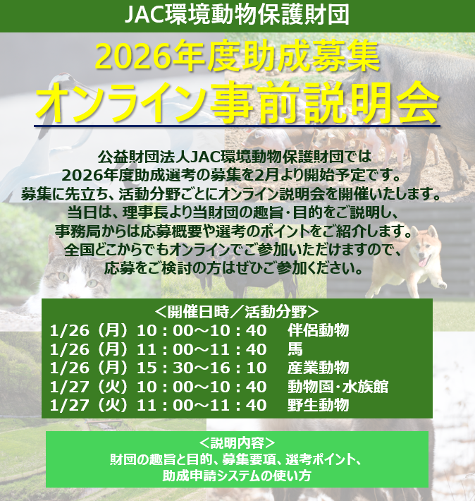 公益財団法人JAC環境動物保護財団では、2026年度助成選考の募集を2月より開始予定です。